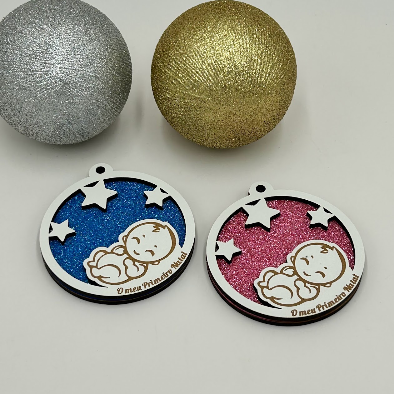 Com um design encantador em MDF, esta bola combina o brilho do fundo com o recorte delicado do bebé e das estrelas, criando uma peça única que eterniza este momento tão importante.