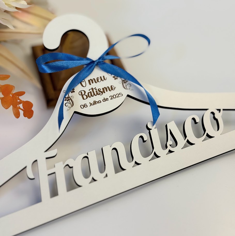 Este delicado cabide foi criado através de corte e gravação a laser em madeira MDF, combinando elegância e significado numa só peça. Personalizado com o nome da criança e a data do batizado, é ideal para eternizar o dia do seu primeiro grande acontecimento religioso.