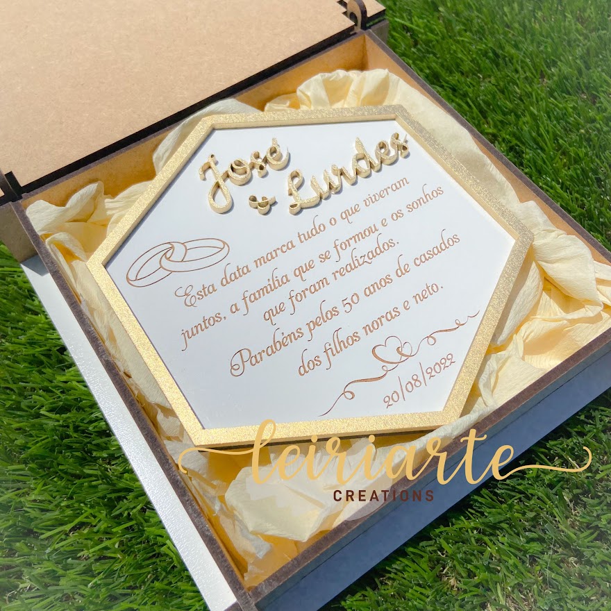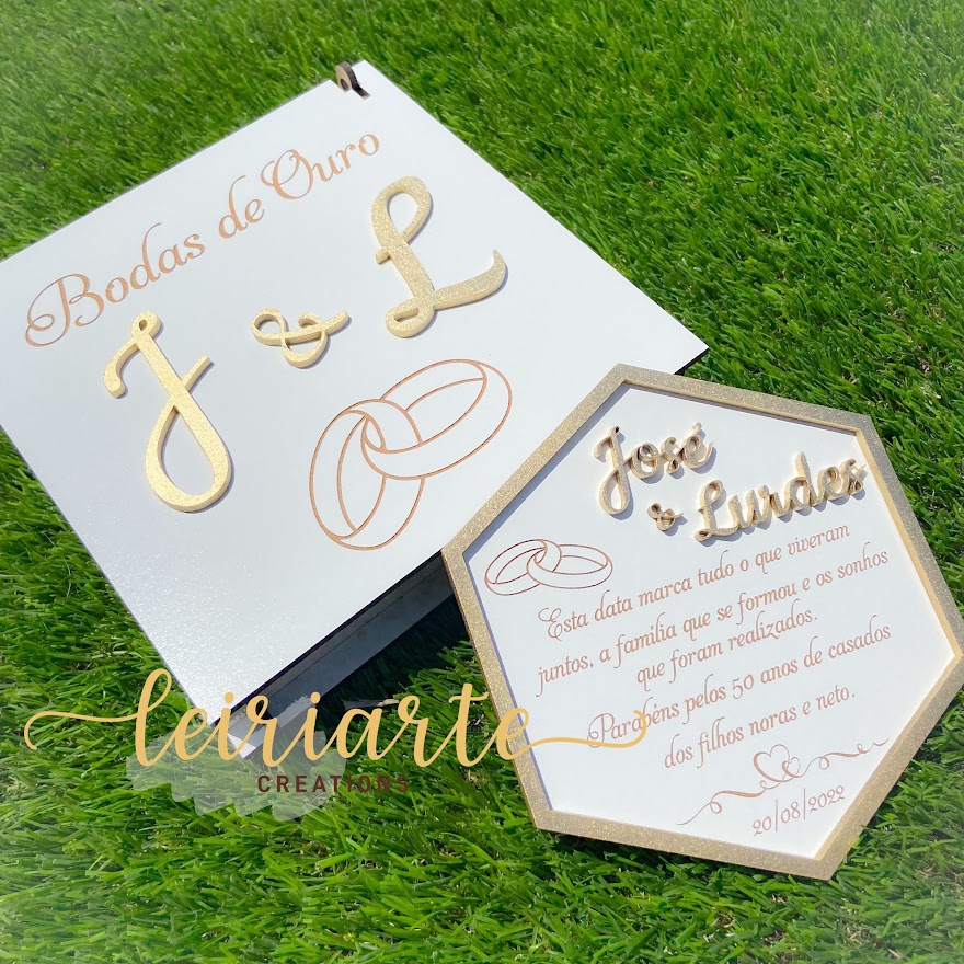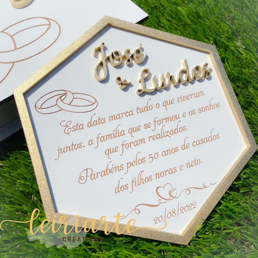 Celebre um momento único e inesquecível com esta elegante placa personalizada para Bodas de Ouro. Produzida com materiais de alta qualidade e acabamento dourado brilhante, esta peça combina design sofisticado com um toque de carinho e emoção.