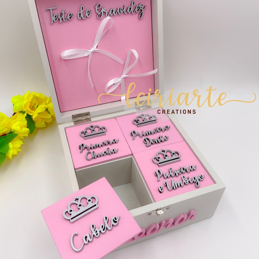 Feita com acabamento delicado e pintada à mão, ela é dividida em compartimentos perfeitos para armazenar lembranças únicas como: