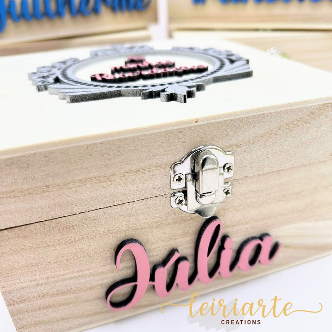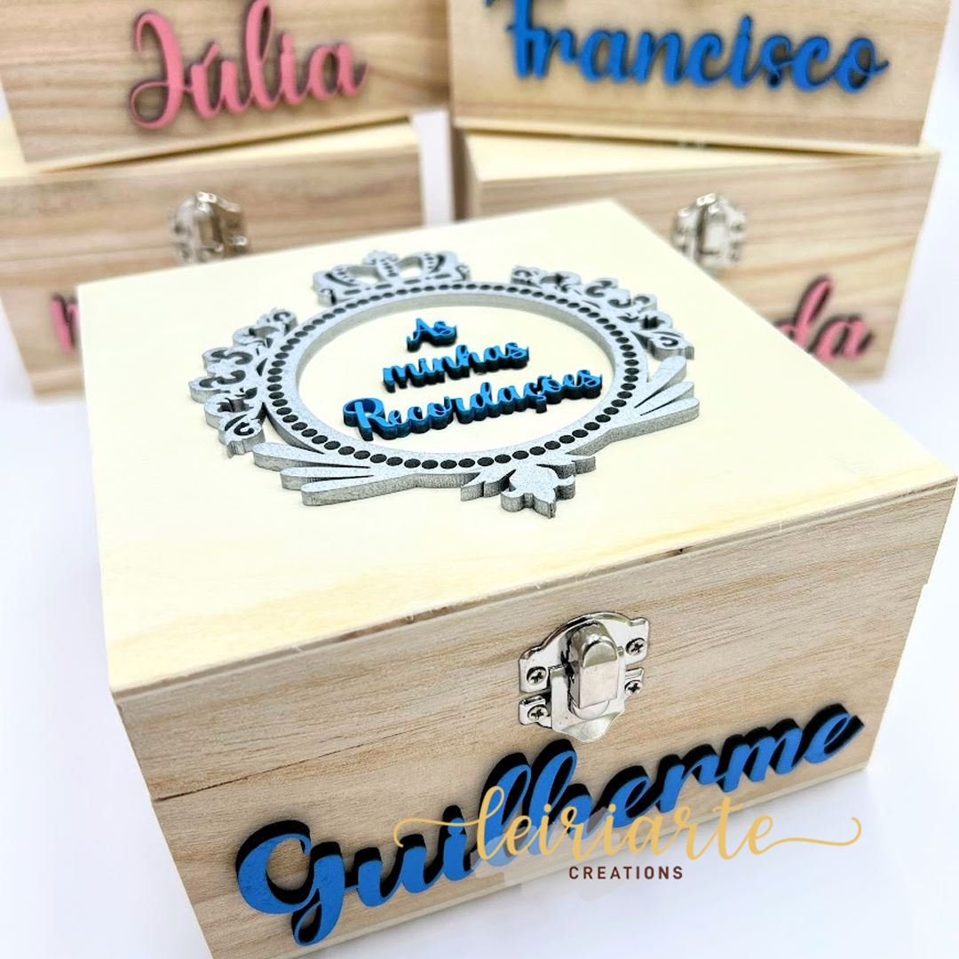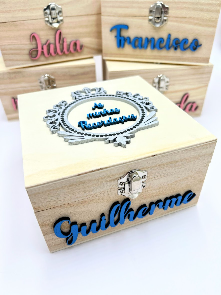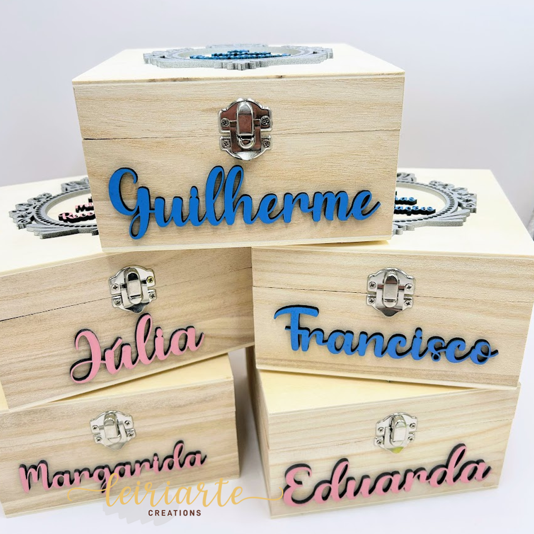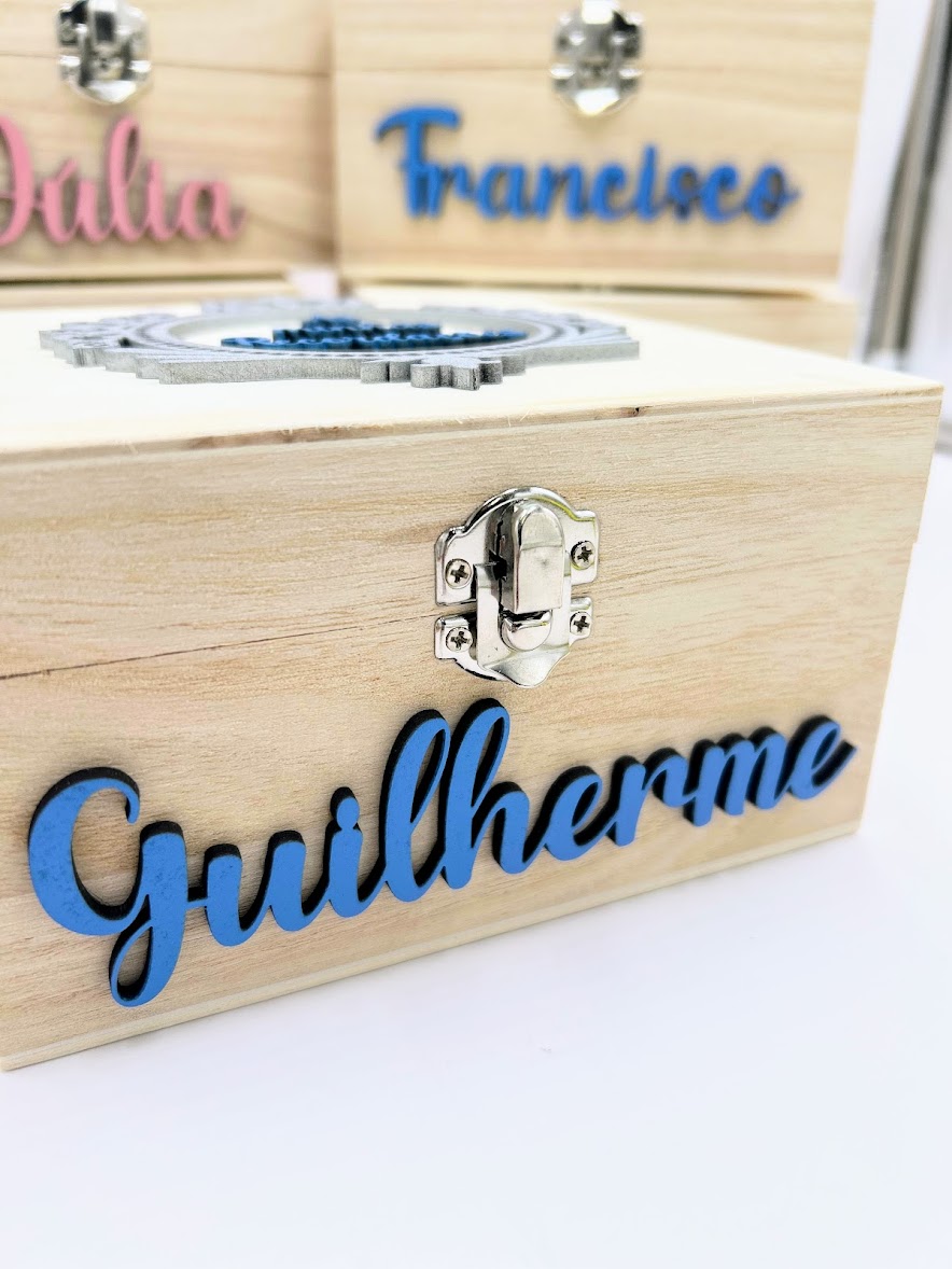 Com um design delicado e um toque artesanal, cada caixinha é personalizada com o nome da criança em letras recortadas em MDF colorido, garantindo exclusividade e charme.