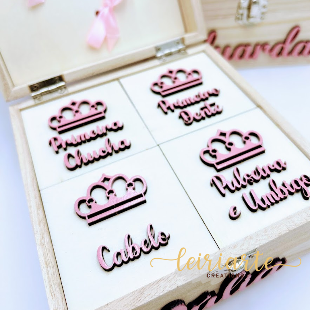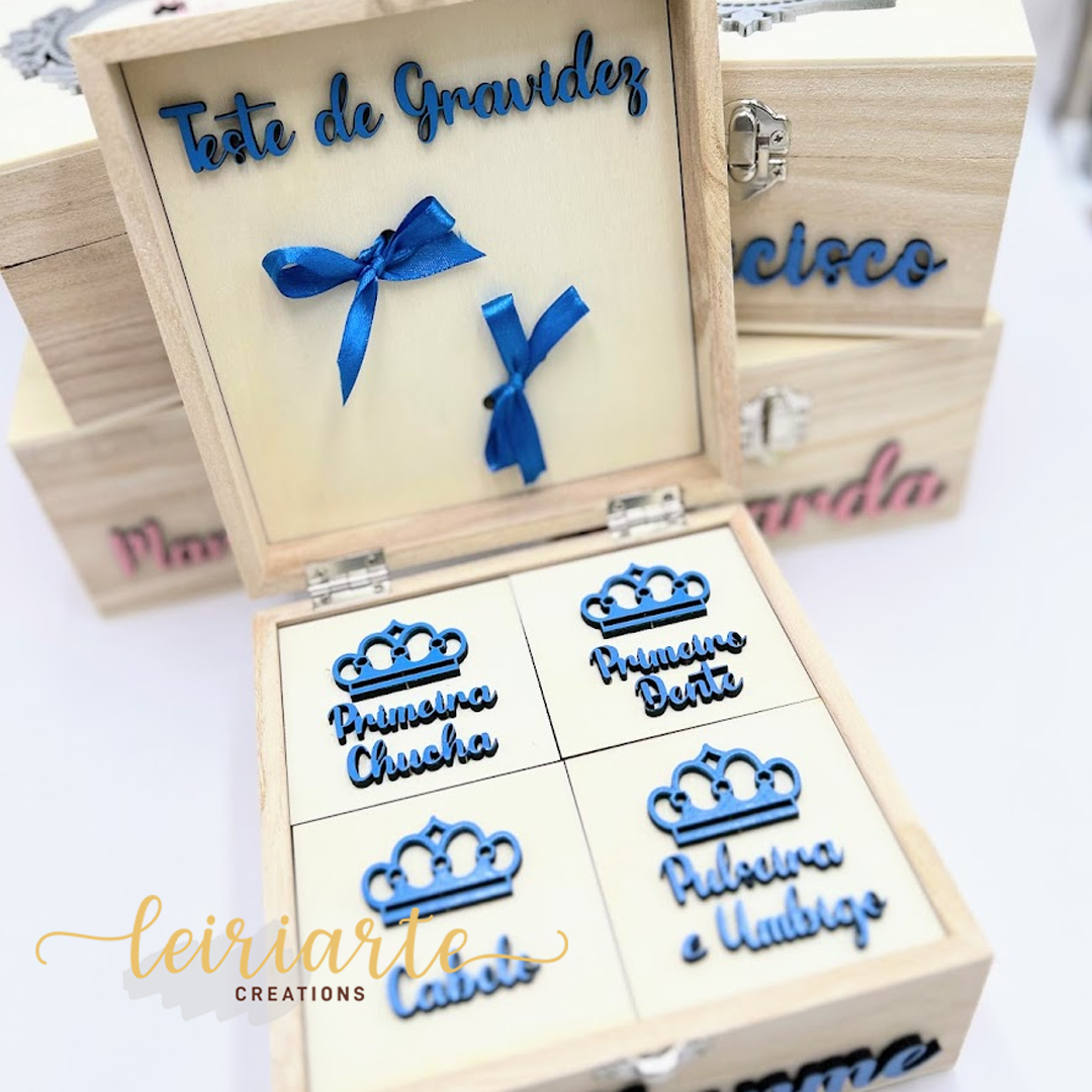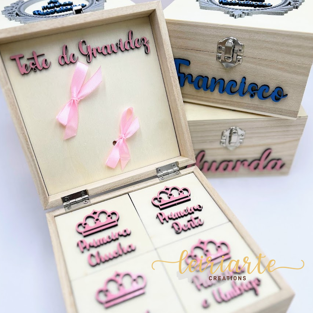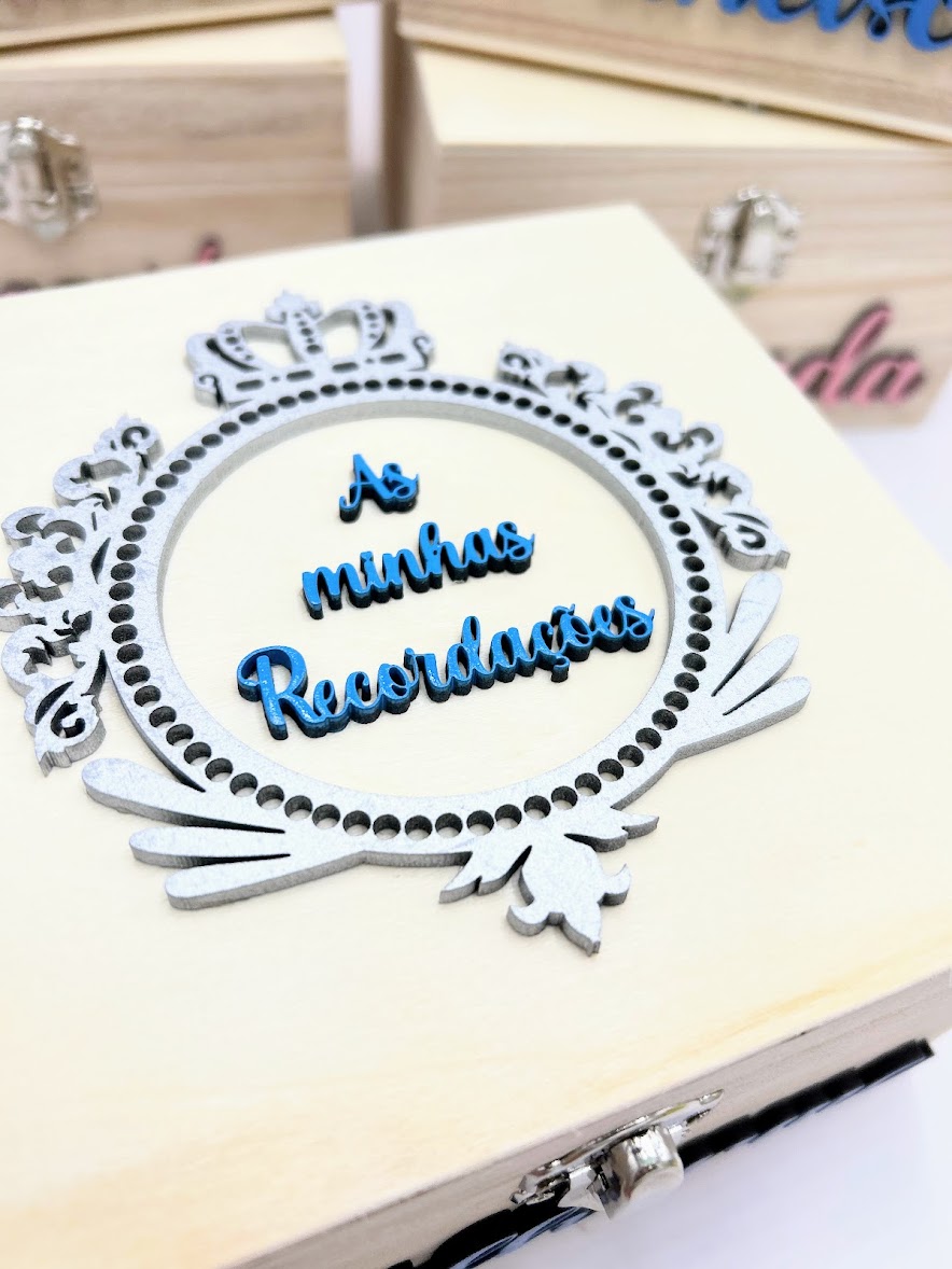 Com um design delicado e um toque artesanal, cada caixinha é personalizada com o nome da criança em letras recortadas em MDF colorido, garantindo exclusividade e charme.