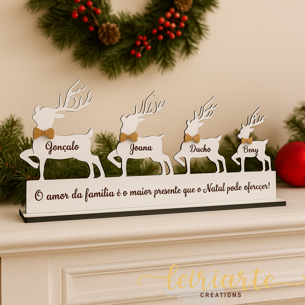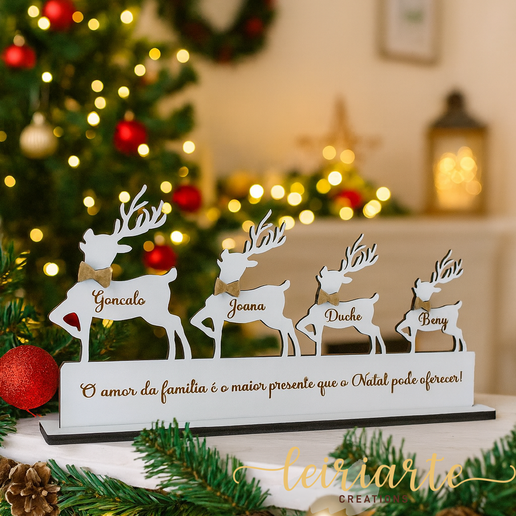 A Família de Renas Personalizada é uma peça única, criada especialmente para representar cada membro da sua família — incluindo até os patudos!