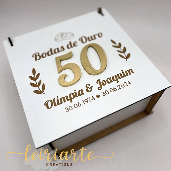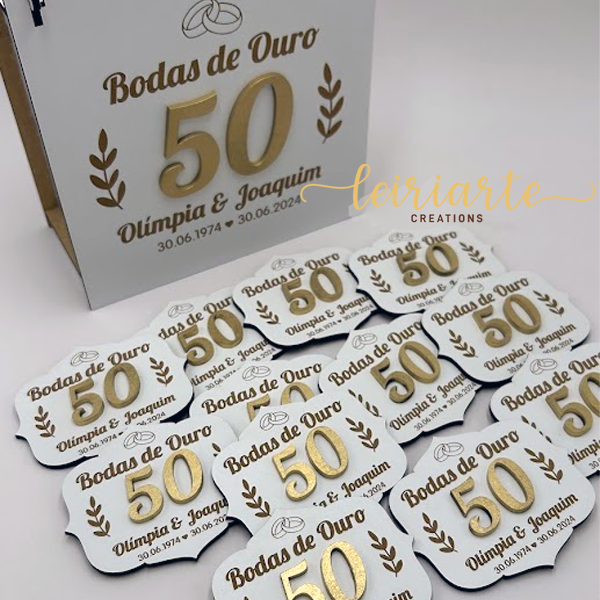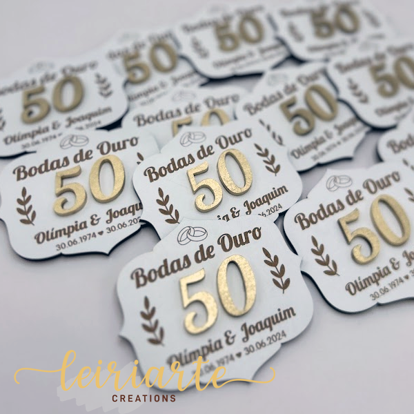 Íman de Bodas Personalizado – Celebre meio século de amor e companheirismo com esta elegante lembrança personalizada para Bodas de Ouro. Produzida com corte de alta precisão e acabamento em dourado, esta peça destaca o número 50 em relevo, transmitindo a importância e a grandiosidade desta data especial.