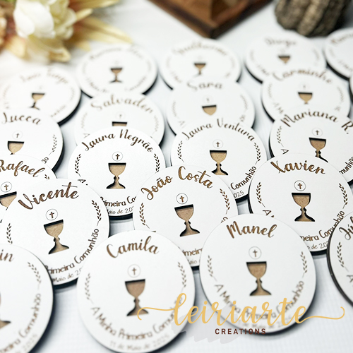 Produzido em madeira de alta qualidade, este íman é cuidadosamente cortado e gravado a laser, com possibilidade de personalização com o nome, a data e um delicado símbolo da Eucaristia.